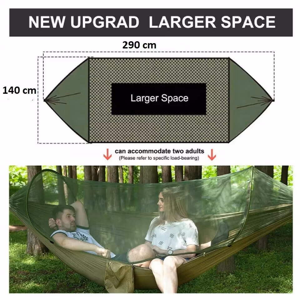 Hängmatta med myggnät Hängmatta av högsta kvalitet är gjorda av 210T fallskärmsnylon. Materialet är mjukt, andningsbart, mögelbeständigt